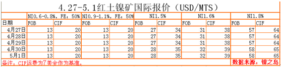 綜述:5月伊始,國內(nèi)中鎳礦市場隨著倫鎳看漲預(yù)期依然存在,加上上周詢盤力度及成交都有所放量,現(xiàn)貨主流報價或小幅走高集中在320-340元之間,期貨中鎳礦由于近期出貨量較少,需求方面有所改善看,礦山或配合倫鎳行情繼續(xù)上調(diào)本周報價。高鎳礦市場無論是國內(nèi)港口現(xiàn)貨或是菲期貨,反應(yīng)給市場的都是較為缺貨狀態(tài),而價格也保持較為堅挺狀態(tài),但作為下游鎳鐵廠而言,考慮到鋼廠對于鎳鐵招標(biāo)價格并未有較大改善,致使鐵廠操作上商有一定難度,本周高鎳礦市場詢盤或有所改善,但成交價格上并不會有較大提高。