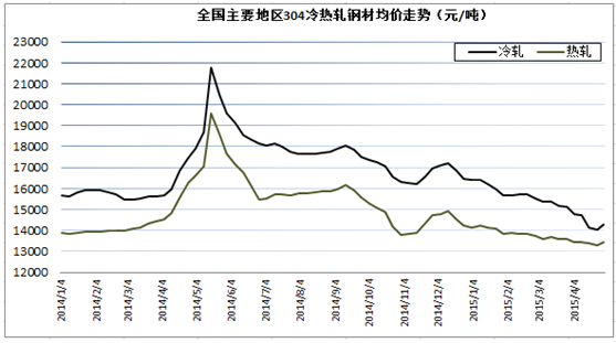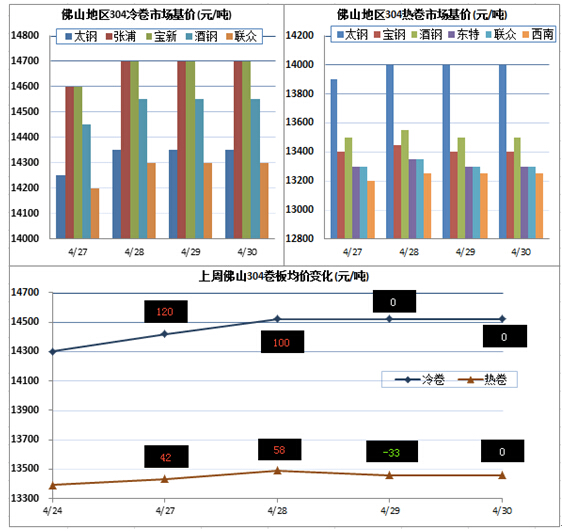 上周佛山地區(qū)304冷卷報價受鎳價影響整體環(huán)比上漲50-150元/噸不等,其中太鋼、張浦、寶新、酒鋼和聯(lián)眾分別為14350、14700、14700、14550和14300元/噸,其中酒鋼現(xiàn)貨資源稀缺、多以厚料為主。熱軋方面,截至周五太鋼報價14000元/噸,而寶鋼、酒鋼和西南不銹分別為13400、13500、13250元/噸,東特和聯(lián)眾均為13300元/噸。鎳價大漲提高了不銹鋼市場成交意愿,但是之前幾周的市場狀況(以冷軋為例)一直處于超跌狀態(tài),因此持續(xù)這股熱度還需鎳價的后續(xù)走勢繼續(xù)上升。