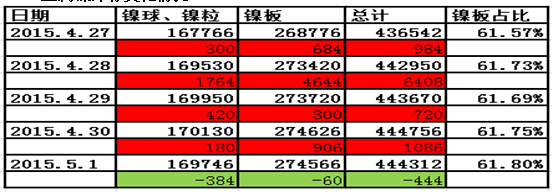 國外方面,上周三美國商務(wù)部公布的數(shù)據(jù)顯示,美國一季度實際GDP年化季環(huán)比初值和第一季度核心PCE物價指數(shù)年化季率雙雙不及預(yù)期,同時,美國上周公布的4月ISM制造業(yè)指數(shù)為51.5,繼續(xù)維持11個月低位。盡管美國首申失業(yè)金人數(shù)創(chuàng)出新低,勞工市場有所改善,但是美國依然無法擺脫經(jīng)濟回暖受阻,經(jīng)濟下行的壓力。上周經(jīng)濟學(xué)家透過FOMC會議紀要的解讀中表示,美國9月加息的可能性大增,受此影響,上周美元指數(shù)出現(xiàn)了大幅的下跌,周內(nèi)跌幅1.69%,在頂部震蕩之后,出現(xiàn)了明顯的反轉(zhuǎn)下行信號。但是,上周美元指數(shù)的下跌卻給金屬價格帶來了一定的支撐,倫鎳也隨之反彈,從匯率方面將會給金屬價格帶來一定時間的利好影響。歐洲方面,上周三歐央行公布數(shù)據(jù)顯示,歐洲近三年的信貸緊縮在3月告一段落,歐元區(qū)對于希臘的債務(wù)擔(dān)憂也將會一直歐元區(qū)的經(jīng)濟復(fù)蘇,隨著希臘償債的時間點臨近,該問題將會繼續(xù)影響歐元區(qū)的經(jīng)濟發(fā)展。