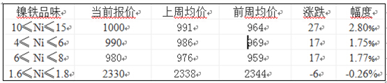 價(jià)格方面,10%≤Ni ≤15%的高鎳鐵出廠報(bào)價(jià)990-1000元/鎳,上周均價(jià)991元/鎳,較前周964元/鎳的均價(jià)上漲27元/鎳,漲幅2.80%;4% ≤Ni ≤6%的中鎳鐵當(dāng)前報(bào)價(jià)為990元/鎳,上周均價(jià)986元/鎳,較前周969元/鎳的均價(jià)上漲17元/鎳,漲幅1.75%;6% ≤Ni ≤8%的中鎳鐵當(dāng)前報(bào)價(jià)為980元/鎳,上周均價(jià)976元/鎳,較前周959元/鎳的均價(jià)上漲17元/鎳,漲幅1.77%;1.6% ≤Ni ≤1.8%的低鎳鐵當(dāng)前報(bào)價(jià)為2330元/噸,上周均價(jià)2338元/噸,較前周2344元/噸的均價(jià)下跌6元/噸,跌幅0.26%。