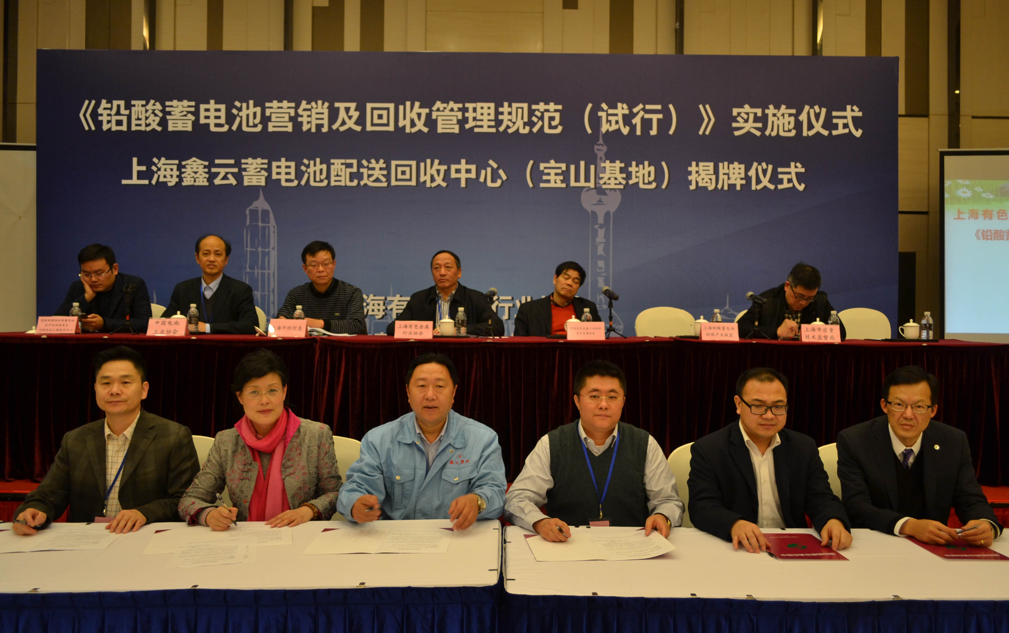2015年12月11日,《鉛酸蓄電池營(yíng)銷及回收管理規(guī)范(試行)》實(shí)施儀式暨上海鑫云蓄電池配送回收中心(寶山基地)揭牌儀式在上海舉行。中國(guó)有色金屬工業(yè)協(xié)會(huì)在生金屬分會(huì)副會(huì)長(zhǎng)李士龍、中國(guó)電池工業(yè)協(xié)會(huì)副秘書長(zhǎng)曹國(guó)慶、上海市經(jīng)濟(jì)和信息化委員會(huì)新材料處處長(zhǎng)蔣瑋、上海市質(zhì)量技術(shù)監(jiān)督局標(biāo)準(zhǔn)化處處長(zhǎng)陶糧民以及來自上海市商務(wù)委市場(chǎng)體系處、上海市促進(jìn)中小企業(yè)發(fā)展協(xié)調(diào)辦公室等領(lǐng)導(dǎo)出席了此次儀式。上海有色金屬行業(yè)協(xié)會(huì)會(huì)長(zhǎng)、上海蓄電池環(huán)保產(chǎn)業(yè)聯(lián)盟會(huì)長(zhǎng)徐明致歡迎詞,聯(lián)盟秘書長(zhǎng)吳小云主持會(huì)議。