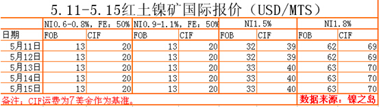 綜述:步入5月中旬,鋼廠及鐵廠復(fù)工情況均有所改善,鎳礦市場(chǎng)詢盤及成交上均已得到體現(xiàn),國(guó)內(nèi)港口現(xiàn)貨來看,唯一制約成交上升的主因還是付款方式和貨源品質(zhì)問題。期貨鎳礦資源短時(shí)間的供給失衡是導(dǎo)致步入5月份以來不斷上調(diào)報(bào)價(jià)的主因,并且在付款方式上對(duì)于工廠而言更加的親睞期貨礦。由于倫鎳盤面的回調(diào)導(dǎo)致操作商對(duì)于后市有所顧忌,本周鎳礦市場(chǎng)或以維穩(wěn)為主。