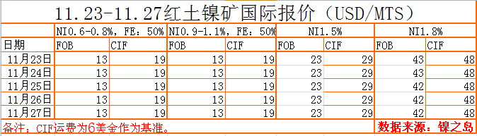 隨著期貨行情有所好轉(zhuǎn),鋼廠對于鎳鐵招標價有所上調(diào),江蘇某鋼廠以730/鎳招標,環(huán)比上調(diào)40元/鎳。據(jù)了解,工廠對于此價格供貨繆繆,普遍心理價位在780/鎳。步入年底,低迷的鎳價伴隨資金流緊張,鎳礦市場基本處于“休假”狀態(tài)。