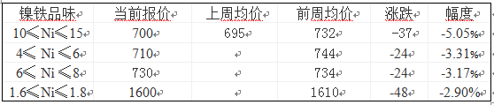 價格方面10%≤ Ni ≤15%的高鎳鐵出廠報價690-700元/鎳,上周均價695元/鎳,較前周732元/鎳的均價下跌37元/鎳,跌幅5.05%;4% ≤ Ni ≤ 6%的中鎳鐵當前報價為710元/鎳,上周均價710元/鎳,較前周744元/鎳的均價下跌34元/鎳,跌幅4.57%;6% ≤ Ni ≤ 8%的中鎳鐵當前報價為700元/鎳,上周均價700元/鎳,較前周734元/鎳的均價下跌34元/鎳,跌幅4.63%;1.6% ≤ Ni ≤ 1.8%的低鎳鐵當前報價為1600元/噸,上周均價1600元/噸,較前周1610元/噸的均價下跌10元/噸,跌幅0.62%。