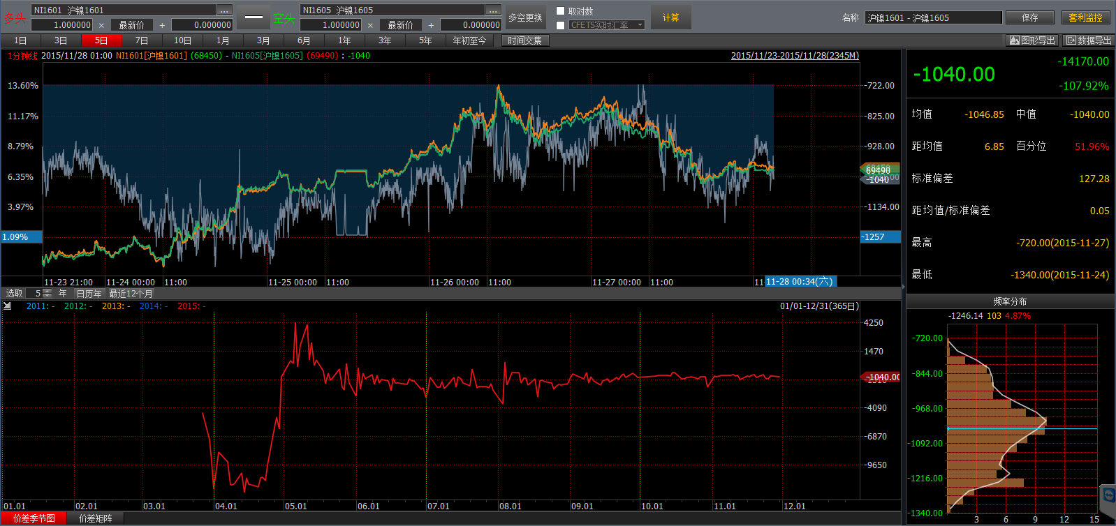 NI1601|1605合約價差套利概述:價差最高收斂至-720、最低-1340、均值-1046.85,價差整體呈現(xiàn)逐漸收斂狀態(tài)。從持倉來看,主力1601合約單周減倉105530手(雙邊),1605合約單周增倉55950手(雙邊)。主力合約投機頭寸減倉較為明顯。從主力頭寸來看,多頭主力減倉明顯是造成價差縮小的主因。但隨著臨近交割月,在交易所合約持倉就限制加上多頭目前移倉損失縮小等原因,本周理論上多頭或持續(xù)移倉造成價差進一步擴大。建議投資者可關(guān)注空近多遠策略,預計價差將擴大至-1800|-2000左右。