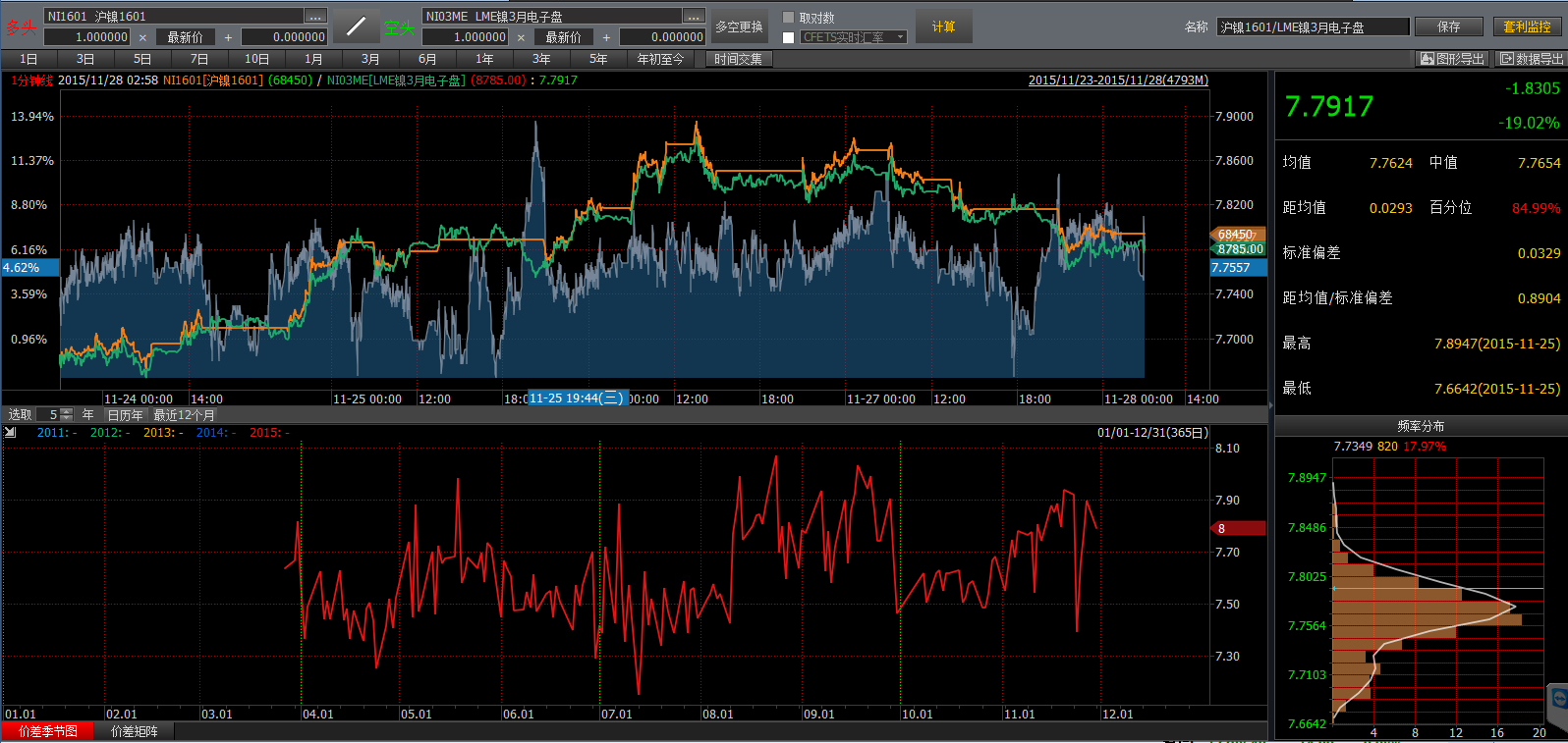 NI1601|LME鎳比價分析:比價最高7.8947、最低7.6642、均值7.7624.上周比價整體寬幅震蕩,上周整體基本進口盈利敞口較小,但受國內(nèi)跌停漲停影響,比價一度出現(xiàn)背離現(xiàn)象。從庫存來看,LME上周單周庫存減少3438噸,SHFE交割庫庫存增加1616噸。從匯率來看,上周美元破百,人民幣再度貶值,進口鎳板利潤更進一步縮小。就目前比價來看,LME庫存仍在源源不斷移庫至國內(nèi),上海交割庫地區(qū)據(jù)了解可用庫容較為緊張,建議投資者可正套入市,多LME鎳,空1601合約。