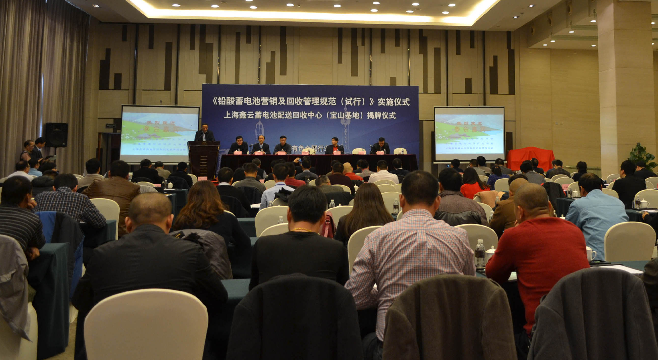 2015年12月11日,《鉛酸蓄電池營(yíng)銷及回收管理規(guī)范(試行)》實(shí)施儀式暨上海鑫云蓄電池配送回收中心(寶山基地)揭牌儀式在上海舉行。中國(guó)有色金屬工業(yè)協(xié)會(huì)在生金屬分會(huì)副會(huì)長(zhǎng)李士龍、中國(guó)電池工業(yè)協(xié)會(huì)副秘書長(zhǎng)曹國(guó)慶、上海市經(jīng)濟(jì)和信息化委員會(huì)新材料處處長(zhǎng)蔣瑋、上海市質(zhì)量技術(shù)監(jiān)督局標(biāo)準(zhǔn)化處處長(zhǎng)陶糧民以及來自上海市商務(wù)委市場(chǎng)體系處、上海市促進(jìn)中小企業(yè)發(fā)展協(xié)調(diào)辦公室等領(lǐng)導(dǎo)出席了此次儀式。上海有色金屬行業(yè)協(xié)會(huì)會(huì)長(zhǎng)、上海蓄電池環(huán)保產(chǎn)業(yè)聯(lián)盟會(huì)長(zhǎng)徐明致歡迎詞,聯(lián)盟秘書長(zhǎng)吳小云主持會(huì)議。
